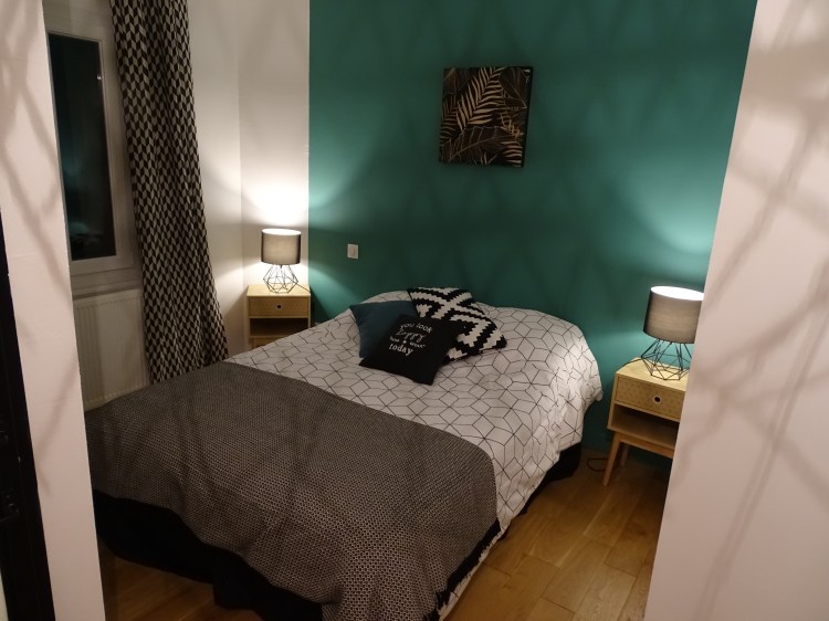 La chambre Emeraude, dans un style contemporain avec lit double (140/190), salle de bain et toilettes privatifs, vous apportera tout le confort nécessaire.